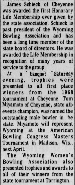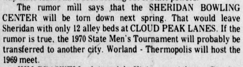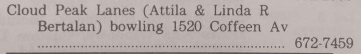 Oscar and Reynold Locken were the owners/managers per the 1966 Polk Sheridan City Directory. In 1968, at the State Bowling Association's 19th annual meeting, they awarded the 22nd Annual Men's State Tournament to the city of Sheridan to help them prepare for the event in advance but the actual tournament was held in Laramie, not Sheridan, when the Sheridan Bowling Center was scheduled to close before the tournament. Attila and Linda Bertalan were the owners/managers from 1976 through 1997 per the Polk Sheridan City Directory. In 1979, the 31st Annual Wyoming Men's State Bowling Tournament was held here. In 1988, the 40th Annual Wyoming Men's State Bowling Tournament was held here. On June 3rd and 4th 1989, the Wyoming BPAA High Five Tournament was held here. In 1992, the 47th Annual Wyoming Women's State Bowling Tournament was held here. In 1998, the 53rd Annual Wyoming Women's State Bowling Tournament was held here. In 2002, the 54th Annual Wyoming Men's State Bowling Tournament was held here. Troy Cochran purchases Cloud Peak Lanes in November 2019 from the Hardesty family. The number of lanes were reduced in June 2024 to accommodate a brand new arcade area (lanes 17-20 removed). |