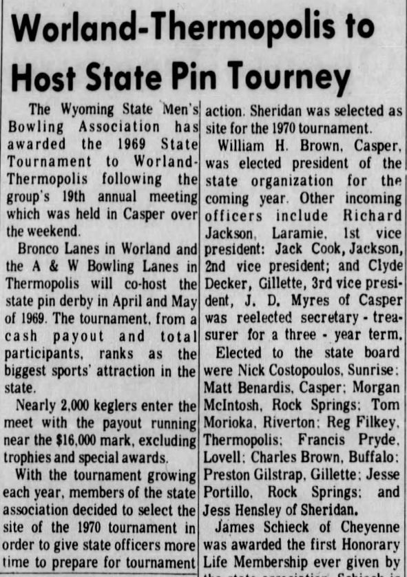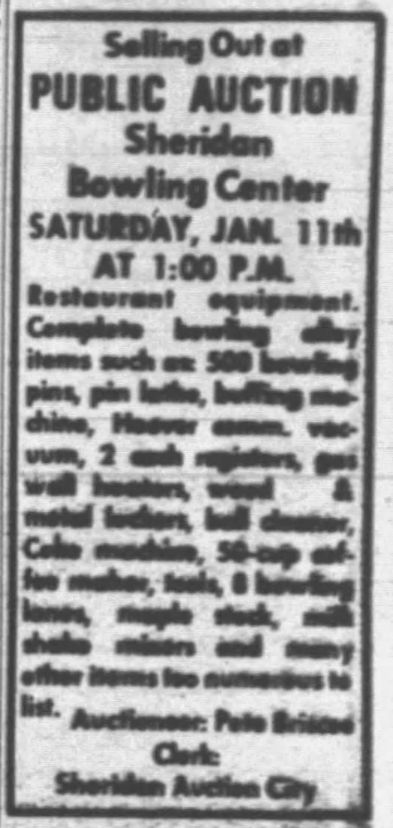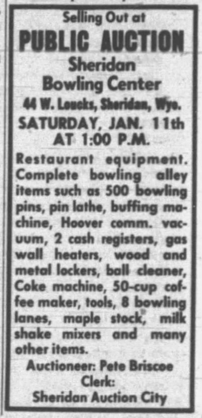 Kenneth Haynes sold the lanes to James F Burk from Boulder Colorado Jan 10, 1946 per the Sheridan Press. At some point between 1949 and 1953, the alley changed their phone number from 569 to 300! Walter K Miller was the owner/manager of the alleys per the 1953-54 Rocky Mountain Business Directory. Henry B Hannum was the owner/manager of the alleys per the 1955 Rocky Mountain Business Directory. Between 1955 and 1957 (per the phone book) the alleys changed names from Sheridan Recreation Center to Sheridan Bowling Center. Carl E Hendrickson was the owner/manager of the alleys per the 1966 Polk Sheridan City Directory. In 1968, at the State Bowling Association's 19th annual meeting, they awarded the 22nd Annual Men's State Tournament to the city of Sheridan to help them prepare for the event in advance but the actual tournament was held in Laramie, not Sheridan, when the Sheridan Bowling Center was scheduled to close before the tournament. A public auction was held on January 11, 1969 to sell the contents of the bowling alley. |